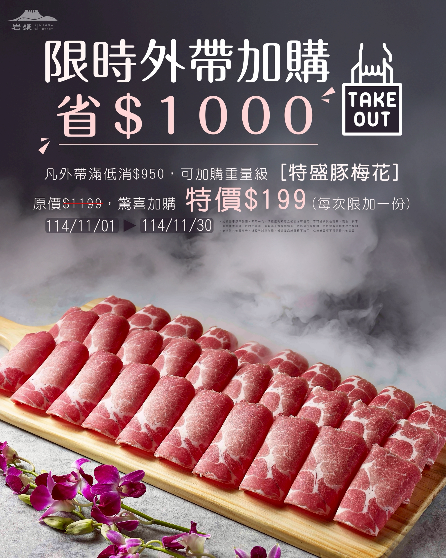 不想出門也能享受岩漿的滾燙美味!凡外帶滿$950,即可用 $199 加購【特盛豚梅花】 一份(原價$1199)肉香四溢、油花誘人,讓你的外帶鍋一秒升級成豪華饗宴!